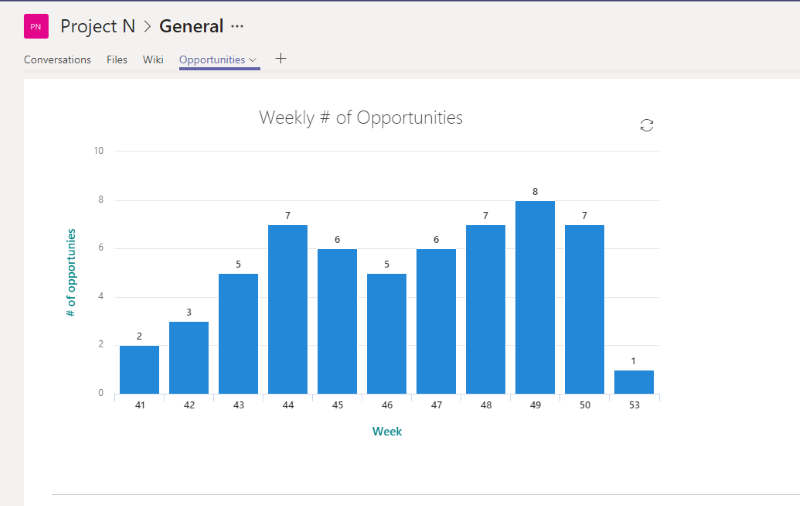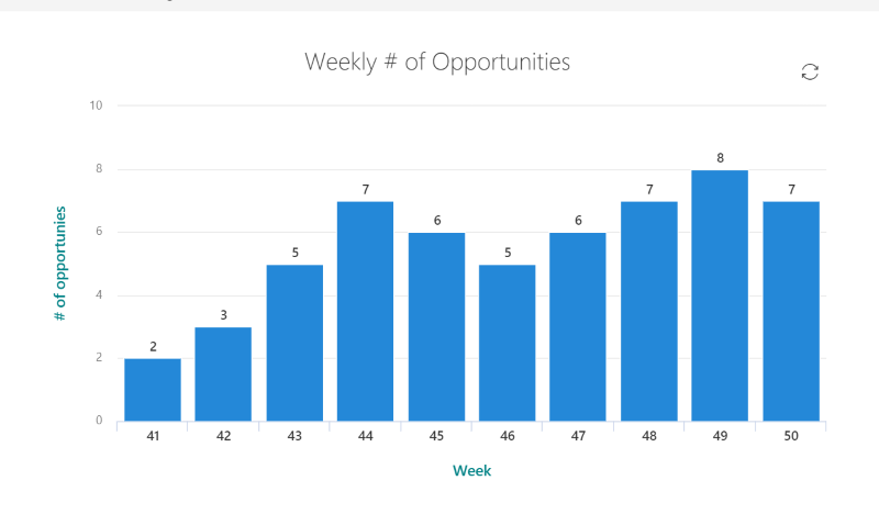 This is a very simple example for displaying weekly count of opportunities created to Dynamics 365. Weekly count is updated, when new opportunity is added.