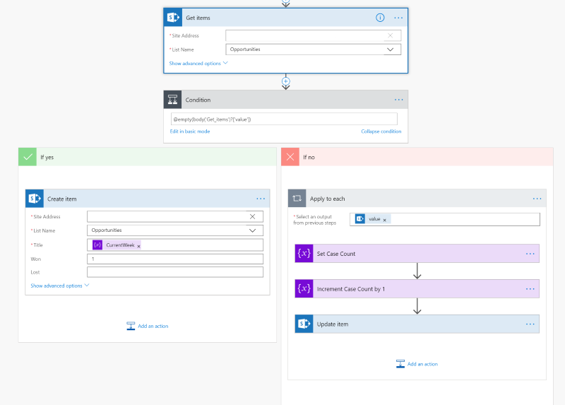Update Flow is triggered, when new opportunity is created to Dynamics 365. Flow will increase the case count on current week to SharePoint list.