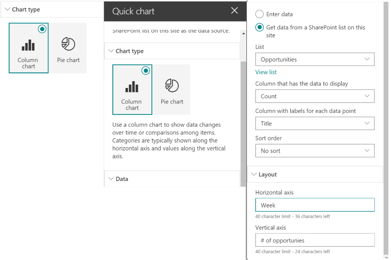 For this example list’s Title column is used as week number, and column can be renamed to Week, if needed. Add Quick chart web part to a page and configure it to display data from Opportunities list.
