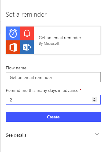 Reminder flows for SharePoint lists and libraries were published to Targeted Release Office 365 tenants in the beginning of January 2019. Reminder flow is an very simple way to create a reminder based on date column on a list or a library on SharePoint. When date column is added, the Flow menu offers “Set a reminder” selection and display all date columns, which are available on a list view. By default, flow sends email reminder to user who created a reminder.