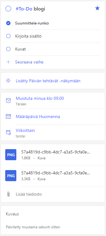 Microsoft To-Do on muutaman viime kuukauden aikana kehittynyt todella mainioksi tehtävienhallinnan välineeksi, erityisesti Office 365 -ympäristössä. Itselläni To-Do on päivittäisessä käytössä oman ajan ja tehtävien hallintaan, ja olen ollut aktiivinen käyttäjä To-Do:n julkaisusta lähtien. Aiemmin käytössäni oli Wunderlist, joten siirtymä oli todella helppoa käyttöliittymän ja toiminnallisuuksien samankaltaisuuden vuoksi. Nykyisin Wunderlistissa olevat tehtävät saa siirrettyä suoraan Wunderlist-tililtä To-Do:hon ja To-Do on käytännössä se uusi versio Wunderlistista.