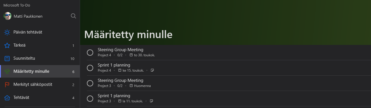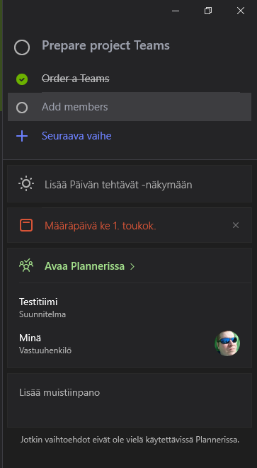Nämä muutokset päivittyvät Planneriin lähes reaaliajassa. Lisäksi näkymästä voi avata tehtävän suoraan Planneriin ja asettaa tehtävä To-Do:n Päivän tehtävät -näkymään.