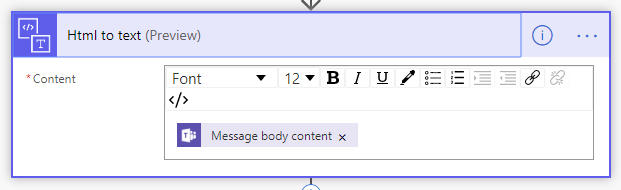 Content of the conversation is commonly on HTML format, which causes some issues with SharePoint view formatting, so it needs to modified to plain text on the Flow. I used “Html to text” action to handle it, just put in a “Message body content” from the trigger.