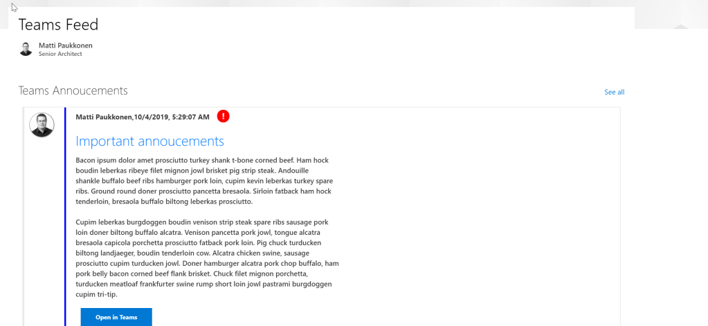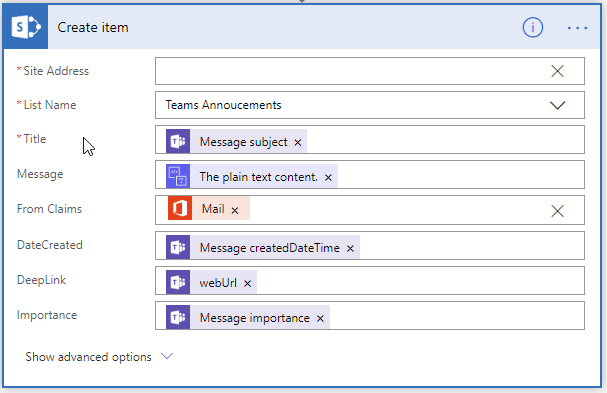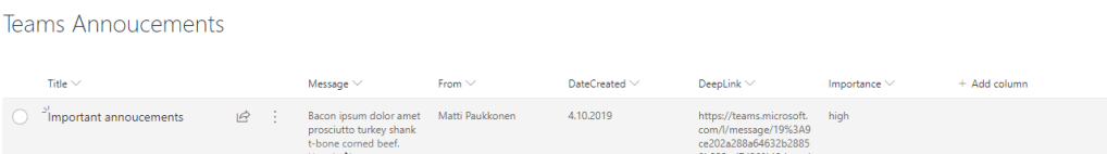 Since Microsoft Teams is taking more and more control over organization communications, there might be a need for displaying certain discussion, like important announcement or conversations from organization wide team, on SharePoint Online. As a low-code solutions, this requirement can be fulfilled with help of Microsoft Flow, SharePoint list and list view formatting.