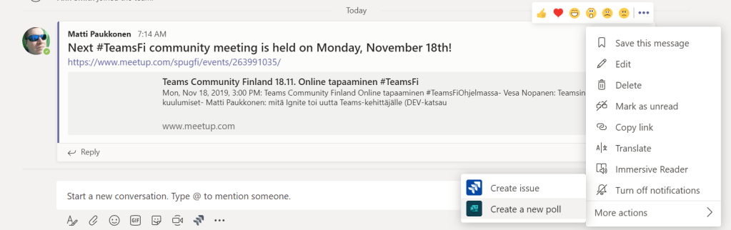 With Forms message extension, creating a poll is more simple. Just open message extension from three dots after reactions, open More actions and click Create a new poll.