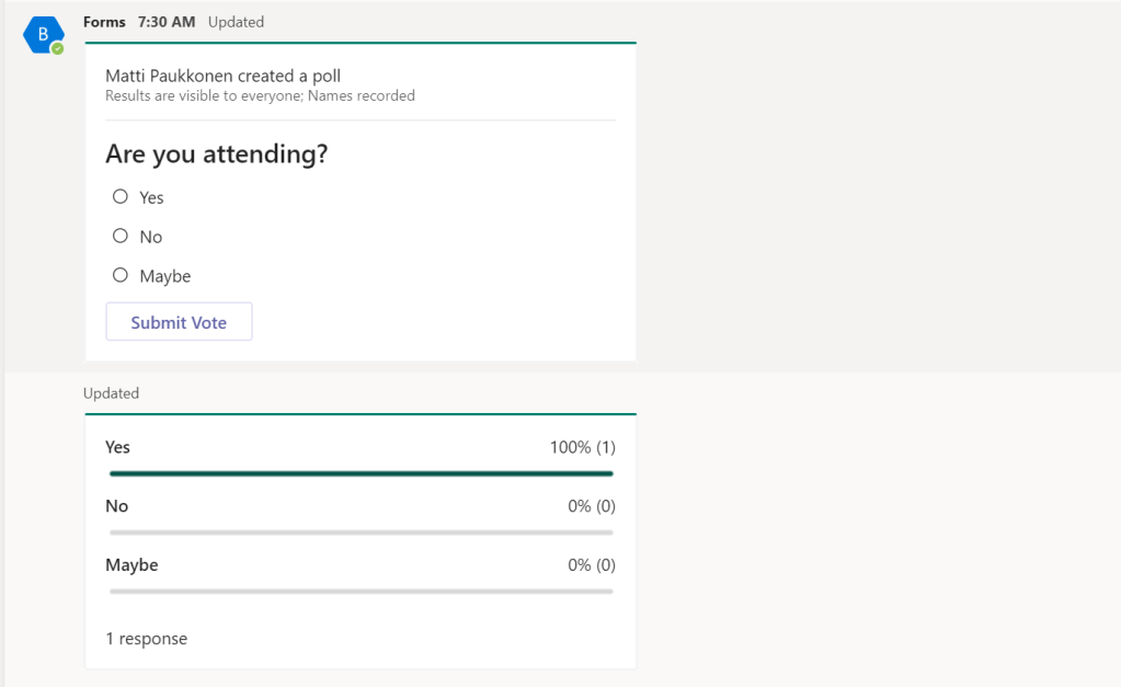 Creating polls with Microsoft Forms is not a new feature on Microsoft Teams. It have been possible to utilize Forms bot for creating polls, but using a bot is not so intuitive for end-users – at least I always needed to check, what the actual format was to create a new poll.