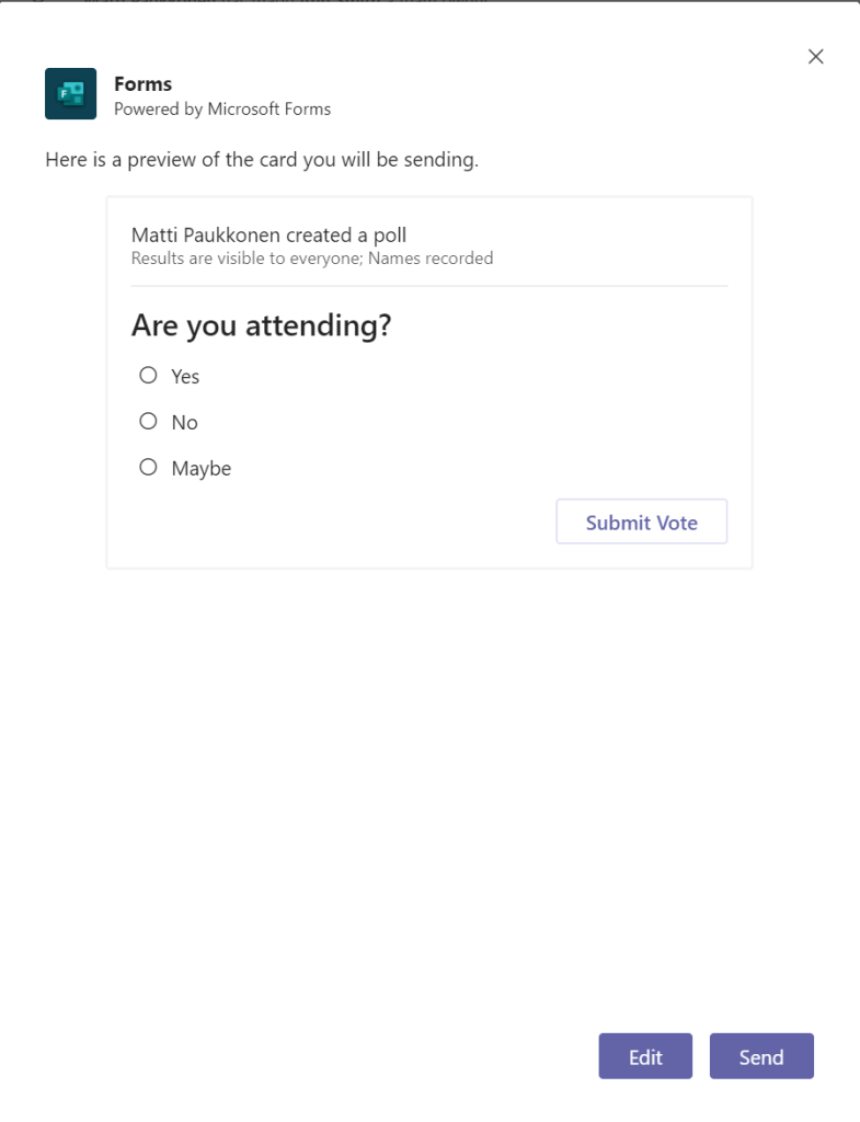 After clicking Next a preview card is shown, this didn’t work for me at first. From preview dialog you can get back to editing the poll or send it.