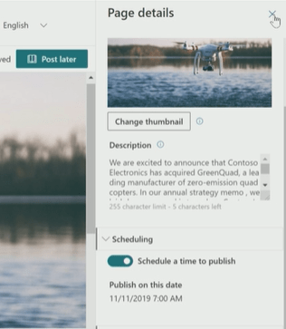 Jatkossa julkaisun ajastus tulee kaikkiin moderneihin sivuihin ja uutisiin. Ajastus kytketään päälle Sivun tiedot -paneelin kautta, ja kun ajastus on asetettu, tarvitsee vain julkaista uutinen. Käyttötapa on selkeästi yksinkertaistettu perinteisestä SharePointista mikä on pelkästään hyvä ja lisäksi ominaisuus on saatavilla kaikille sivuille ilman erillisiä asetuksia.
