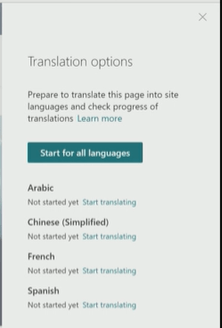 Jatkossa saadaan käännökset myös sivuille ja uutisille sekä kielivalinta loppukäyttäjille. Halutut käännökset hallitaan sivuston kieliasetuksilla, ja tätä varten sivuston kieliasetuksille saadaan modernimpi käyttöliittymä. Nyt sivuston kieliasetukset ovat entistä tärkeämpää määrittää, koska käännöskopiot luodaan automaattisesti kaikille määritetyille kielille. Kieliasetuksissa voidaan myös jatkossa määrittää vastuuhenkilöt sivujen käännöksille ja SharePoint lähettää automaattisesti ilmoitukset näille henkilöille, kun uusi sivu käännös luodaan tai käännökseen liittyvää alkuperäistä sivua muokataan. Taustalla sivun käännöksiä varten luodaan kielikohtaiset kansiot Sivuston sivut -kirjastoon.