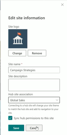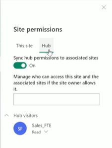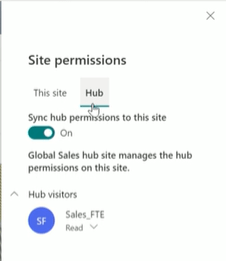 Hub-sivustoihin julkaistiin useita parannuksia, mutta ehdottomasti tärkein ja tälläkin hetkellä kysytty ominaisuus on käyttöoikeuksien määrittäminen koko hubiin. Nykyisellään käyttöoikeudet pitää määrittää käsin tai esimerkiksi tuoda hubiin liitettyihin sivustoihin Site Designin avulla, joka ei taas ole hubin omistajan hallittavissa.