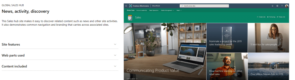 Esimerkkeissä on kerrottu mitä ominaisuuksia, webosia ja sisältöjä niissä on käytetty. Esimerkistä voi suoraan lisätä sen omaan Office 365 -tenanttiin ja muutamassa minuutissa esimerkkisivustoa pääsee kokeilemaan livenä omassa ympäristössä.