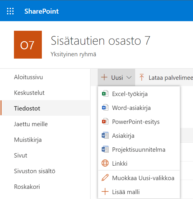 Uusi-painike noudattaa nyt SharePoint-kirjaston Uusi-painikkeen valintoja, joita pääsee muokkaamaan helposti suoraan Uusi-valikosta tai lisäämällä sisältötyyppejä kirjaston asetusten kautta. Tämä on todella odotettu parannus, nyt käyttöön saadaan myös organisaation dokumenttipohjat.