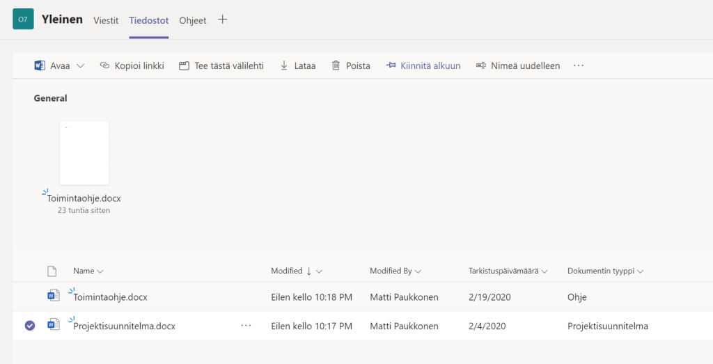 Uusi Tiedostot-välilehti päivittyi vihdoin Microsoft Teamsiin. Uusi näkymä muistuttaa SharePointin dokumenttikirjastonäkymää ja sisältää suuren osan päivittäin tarvittavista perustoiminnallisuuksista. Yhtenä puutteena voisi nostaa metatietojen muokkauksen, joka ei onnistu Teamsin kautta. Toisaalta harvemmin metatietoja enää muokataankaan, ja jatkossa tekoäly hoitaa suurimman osan tarpeista. Varsinaiselle tehokäyttäjälle SharePointissa vierailu voi olla kuitenkin edelleen tarpeen, esimerkiksi juuri metatietojen muokkausta, asetuksia ja Power Automate -työnkulkuja varten.