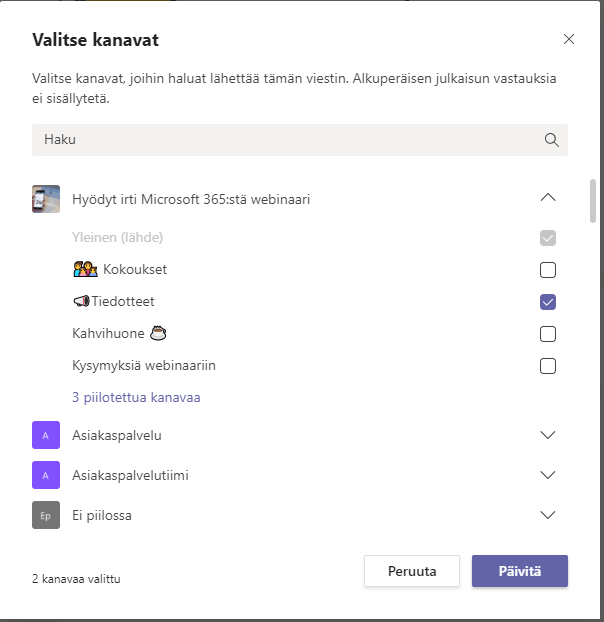 Valitse kanavat -painikkeesta avautuu dialogi, josta valitaan halutut kanavat. Tiimejä ja kanavia voi myös hakea.