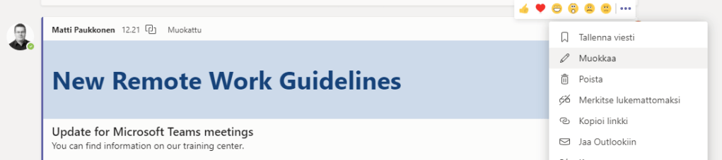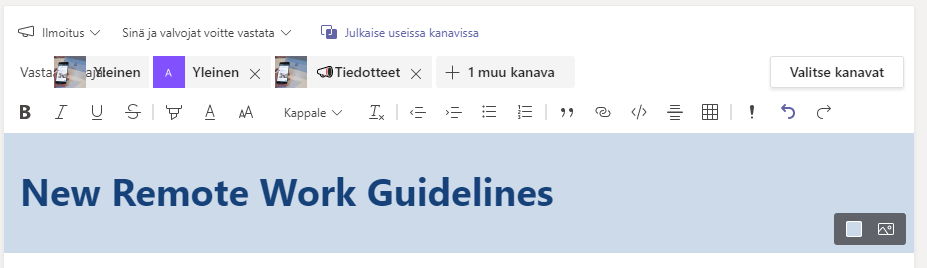 Viestien julkaisu samanaikaisesti usealle kanavalle on päivittynyt Microsoft Teams:issä. Nyt useaan kanavaan julkaistuja viestejä voi muokata niin, että viesti päivittyy samalla kaikilla valituilla kanavilla.