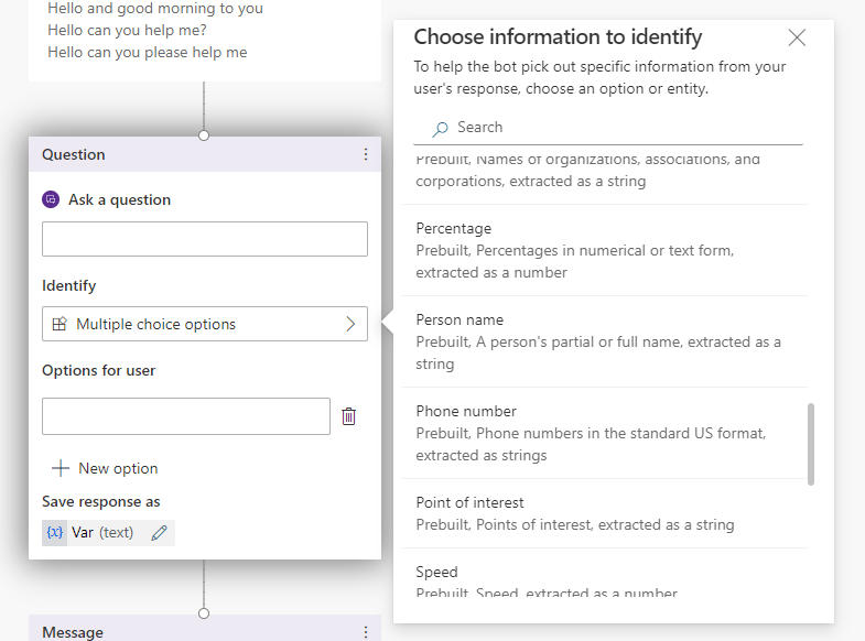 Bot is triggered with a topic, which contains one or more trigger phrases, for example “Hello”, “Good morning”, “Hello friend”. Bot will trigger with all added phrases. Each topic have it’s own “flow” of action. Action can be a message to user, a question, call to action, condition or end conversation with survey. Question can be a multi-choice or based on a entity, like age or percentage, on a database. Response is stored to a variable for be used in later steps. Call to action is actually to separate flow, which can for example notify users on Teams. Survey at the end of the conversation asks was it helpful and opens a five step rating. There is also an option to jump to a different topic.