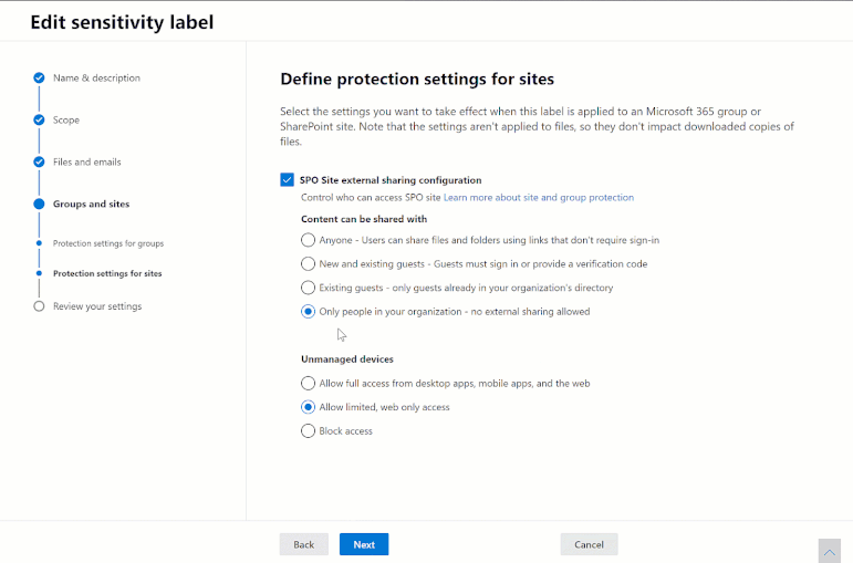 New external sharing policies extends sensitivity label usage to control external access to SharePoint content. Label controls how external sharing is enabled on labeled site with same levels of control available as on tenant level. This new feature enables simple controls for site owners to manage external access, but it also brings responsibility.