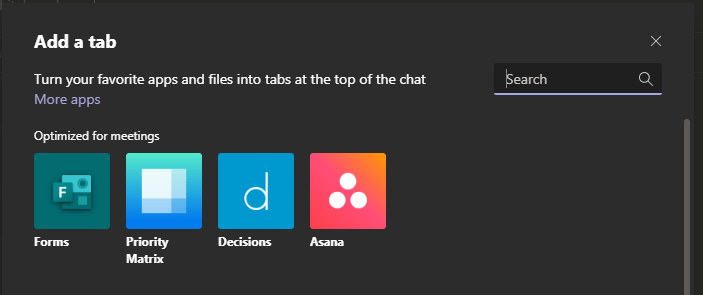 On top of the apps list you will see apps, which are optimized to be used in meetings. Pick Forms, select Add from next info screen and Save on the next one. Now you can start creating new polls for your meeting on the tab. You can also create polls on the fly during meeting using the tab or using new meeting side panel.