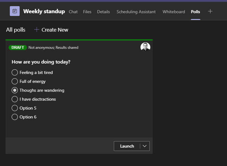 For a single poll you can add a question and up to six options, select is it single or multiple answer, choose to share results automatically and keeping answers anonymous. When you click save, your poll will appear on the Polls tab.
