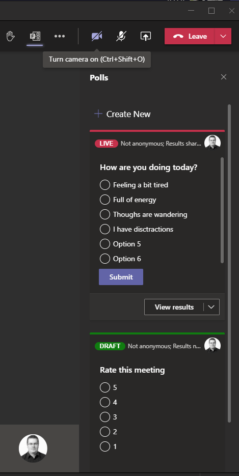 Polls are also sent as cards to meeting chat, so people who join in from mobile or with browser are able to answer and see results.