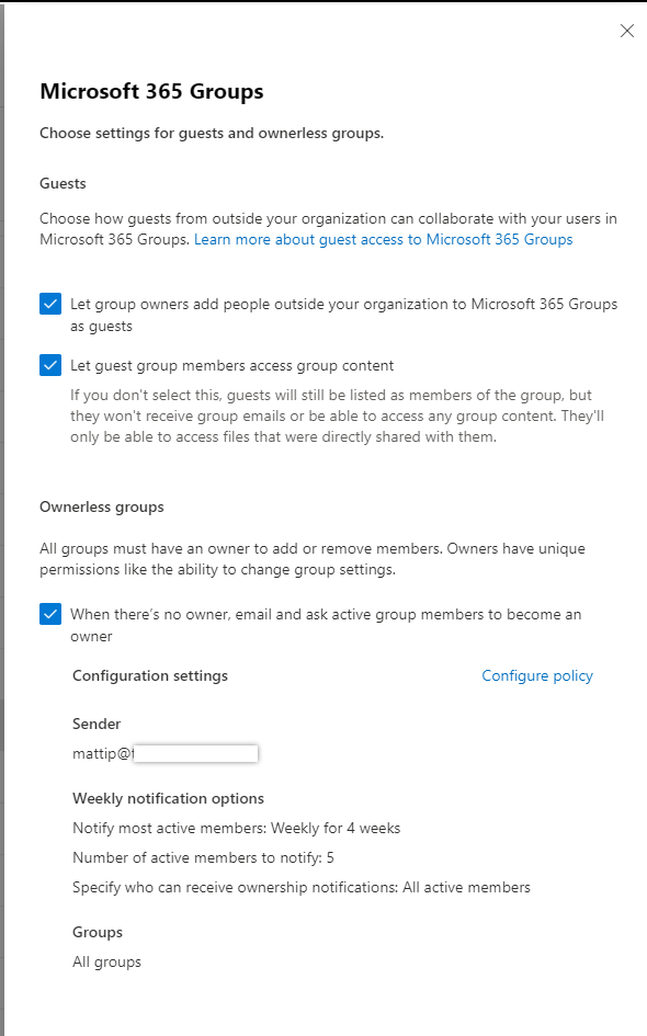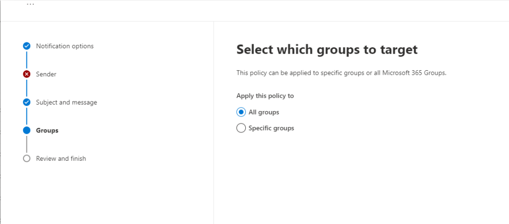 And the last setting is to select is the policy targeted to all Microsoft 365 Groups or just specific groups.