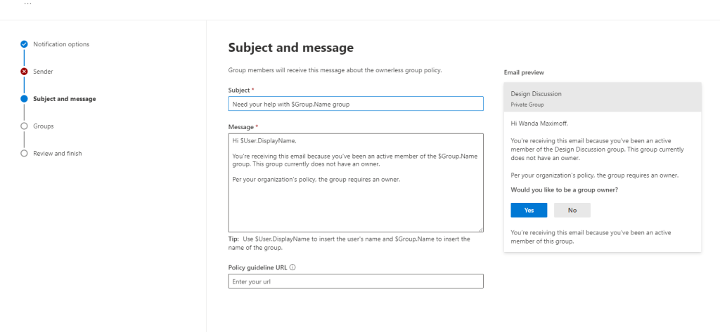 With subject and message settings, administrators can configure personalized email. The group name can be added with $Group.Name tag and personal greeting with user’s name with $User.DisplayName tag. Actionable buttons are added automatically.