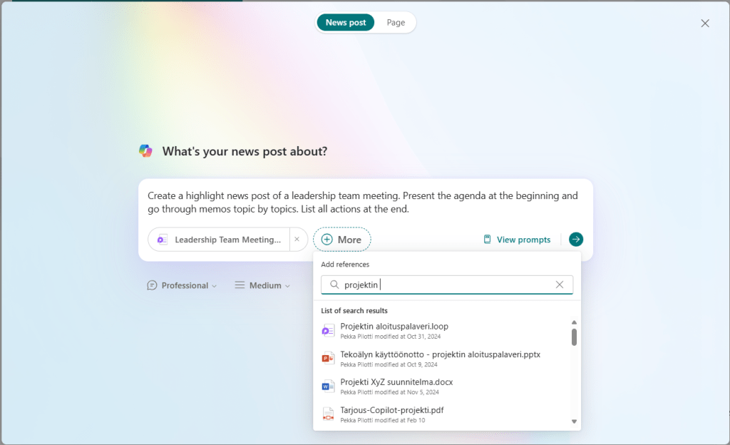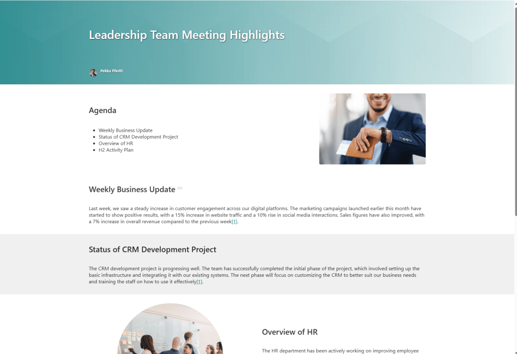 Once you hit Create, Copilot starts creating the page. It creates sections and section layouts, header, and text content. Copilot also adds and formats visuals to the content. Let’s see what happens with a prompt: “Create a highlight news post of a leadership team meeting. Present the agenda at the beginning and go through memos topic by topic. List all actions at the end.” and a reference to the meeting agenda and memo Loop-component.