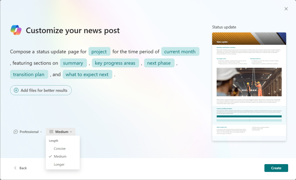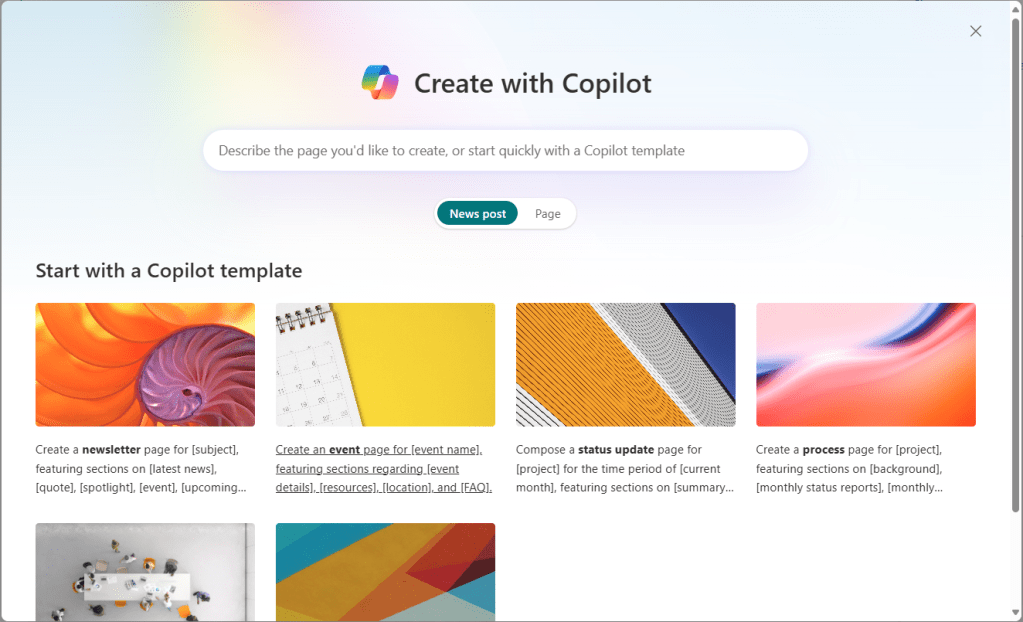 The exciting new ability to create SharePoint pages and news posts using Copilot just appeared on Preview! Now, content authors who hold a Microsoft 365 Copilot license can start creating stunning and engaging pages and news posts using their prompts, ready-made templates, and files. Copilot really simplifies the process of creating a page, especially when creating pages from existing materials, such as service descriptions, product presentations, meeting memos, etc.