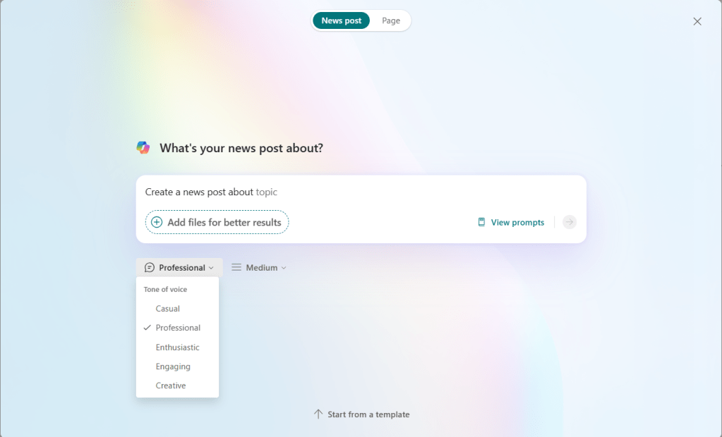 The key difference is that when creating a page or news post by describing, you can formalize your own prompt. When using a template, you just fill out the key information on a ready-made prompt specially crafted for the selected template. You can also adjust the tone and length of the created content. And, use View prompts to get ideas.